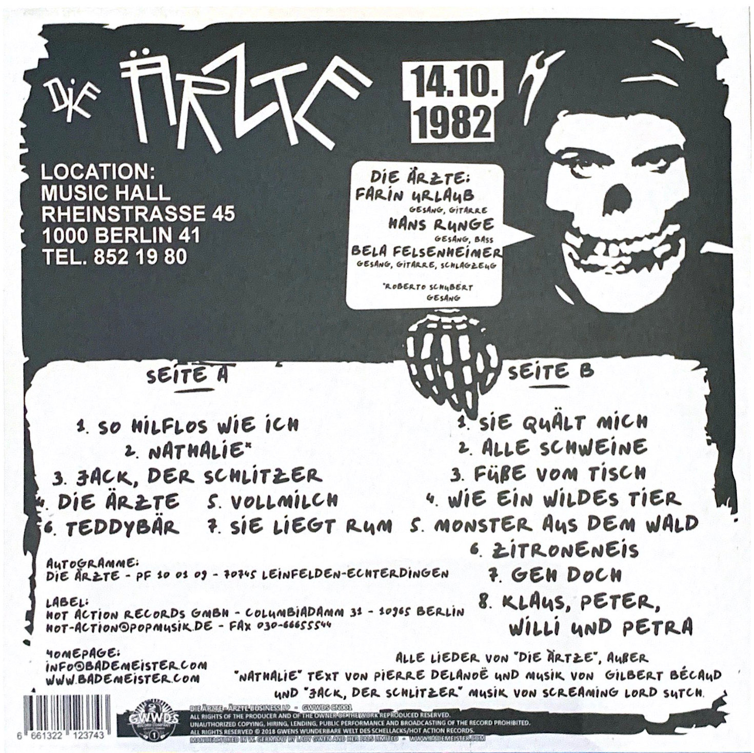 Das französische "Nathalie" ist ein Cover von Gilbert Bécaud und wurde von Roberto Schubert, einem Schulfreund von Farin, gesungen. "Jack, der Schlitzer" ist eine deutschsprachige Coverversion von "Jack The Ripper" von Screaming Lord Sutch. Viele der damals gespielten Songs sind bis heute unveröffentlicht geblieben und finden sich auf keinem weiteren bekannten Livemitschnitt. "So hilflos wie ich" ist die Urversion des 1984 auf "Debil" veröffentlichten "Mr. Sexpistols" und wurde von Bela alleine auf der Gitarre vorgetragen (Ist also showtechnisch quasi der Vorläufer von "Tittenmaus").