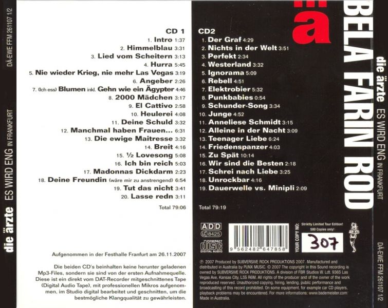 Kompletter Konzertmitschnitt vom Konzert am 26.11.2007 in der Festhalle Frankfurt. Das Bootleg ist als doppel CD erschienen.