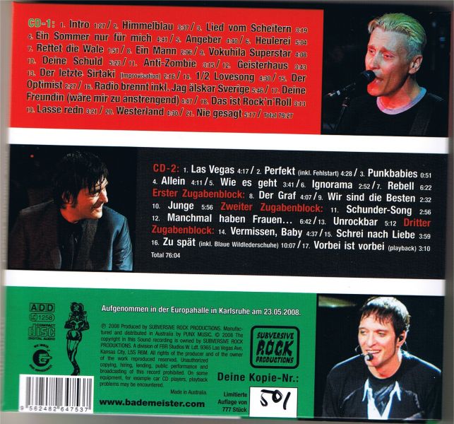 Bootleg enthält kompletten Konzertmitschnitt vom 23.05.2008 aus der Europahalle in Karlsruhe. Es ist als doppel CD erschienen und 'scheinbar' auf 777 Exemplare limitiert.