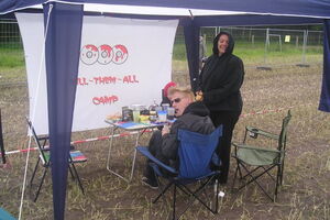 So fuhren wir dann durch die Wallachei und plötzlich sahen wir am Horizont Zelte. Wow! Wie kamen wir nun dort hin? Es ging über Feldwege. Und dann standen wir vor dem Zaun. Wahnsinn! Ich rief keitan an und er sagte mir, dass er noch auf der Autobahn sei, doch der bademeister (nicht 666!), sei schon da. Irgendwann fanden wir sie dann auch. Puh! Nun gings an Zelte aufbauen und man gönnte sich nach der schwierigen Fahrt das erste Pilsken. :)