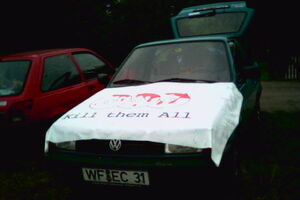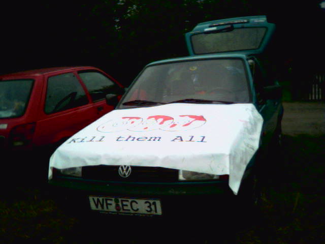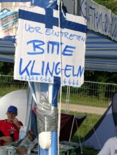 Anfang der Berichterstattung. Los ging's um 16.00 Uhr in Berlin-Charlottenburg, alles und alle (Jessi, den Axelerator und mich) eingeladen. Nachdem Säb während der Fahrt nen paar mal mit Axel telefoniert hat, trafen wir uns auf dem Campingplatz und er führte uns gen KTA-Camp, wo Dago und er schon ihr Lager aufgeschlagen hatten und Johnny, sams, Ärbeersträußchen und Co gerade am Aufbauen waren. Wir ließen es uns nicht nehmen, die ersten paar Male den Campingplatz über selbstgeschaffene Nebeneingänge zu betreten, was in einem Fall gleich nen ganzen Schub von Nachahmern fand.