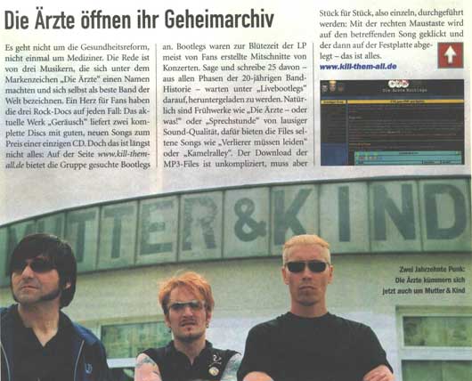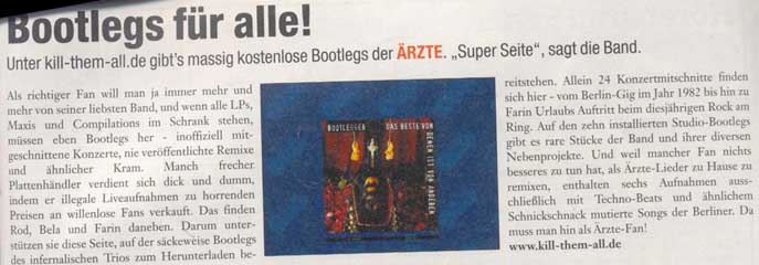 Dass die ärzte diese Seite nicht ganz schlecht finden, zeigt sich schon dadurch, dass sie uns einen Server für die Livebootlegs zur Verfügung stellen. Was sie sonst noch so zum Thema sagen, kann man hier nachlesen.