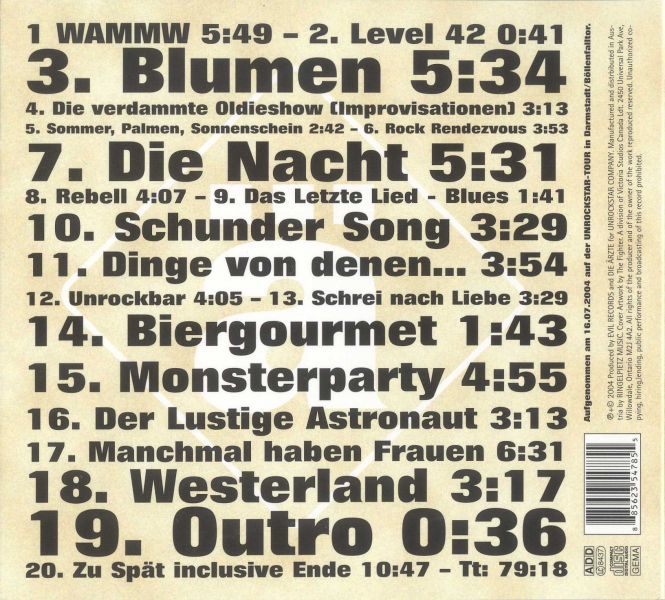Zweiteiliges Bootleg mit dem Konzert auf der Unrockstartour in Darmstadt. Die Qualität ist gut.