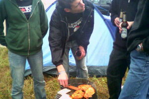 Am Samstag hatten wir dann endlich nen CD-Player am Start, FU-Berlin beschallte uns fortan. Beim traditionellen Frühstücksgrillen experimentierten wir heut ein wenig. Säb, Sträußchen, Felix und der liechti grillten Waffeln, Brotchips, Knoppers, Kirschen (Mmmmhhhmmmm, Grillkirschen) und andere tolle Dinge frei nach dem Motto: "Alles, was man kochen, braten, backen kann, kann man auch grillen!". Sams machte später einen Protestgrill mit völlig unexperimentellem Grillfleisch auf. Wer halt seinem Gaumen keine Abwechslung gönnt...
