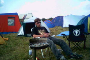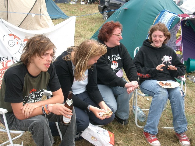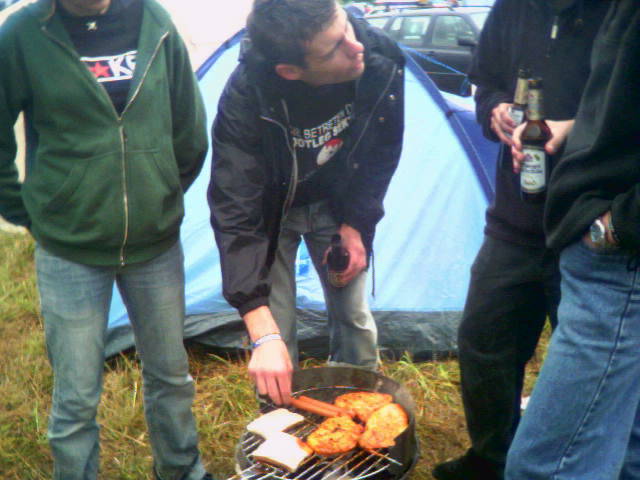 Nachdem wir uns was zum Frühstück gegrillt haben, fuhren wir am nächsten Morgen noch mal einkaufen (wir = Kirsten, der Axelerator, das eine unserer Kinder, Säb und ichse). Kirsten kannte da ne ganz tolle Abkürzung zum Aldi, bei der ihr Auto (Merkt euch, ich steh irgendwo auf Parkplatz 4) auch nur ganz selten auf dem Boden aufsetzte. Wir kauften erstmal für drei Tage Grillwürste, Baguettes und Bier ein (sonst aber auch nix weiter) und ab zum Basislager. Grill anschmeißen! Am Abend rockten uns Kettcar, Wir sind Helden, Rammstein. Oasis spielten auch. Leider ging meine Brille dabei verschipp! Dass ich dadurch auf der Rückfahrt trinken konnte, war ein eher schwacher Trost. Jetzt bin ich erst mal für ein paar Tage ohne Klarblick, da meine letzte Brille das Taubertal 04 nicht überlebt hat... Aus Schaden wird man...egal!