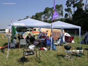 Anfang der Berichterstattung. Los ging's um 16.00 Uhr in Berlin-Charlottenburg, alles und alle (Jessi, den Axelerator und mich) eingeladen. Nachdem Säb während der Fahrt nen paar mal mit Axel telefoniert hat, trafen wir uns auf dem Campingplatz und er führte uns gen KTA-Camp, wo Dago und er schon ihr Lager aufgeschlagen hatten und Johnny, sams, Ärbeersträußchen und Co gerade am Aufbauen waren. Wir ließen es uns nicht nehmen, die ersten paar Male den Campingplatz über selbstgeschaffene Nebeneingänge zu betreten, was in einem Fall gleich nen ganzen Schub von Nachahmern fand.
