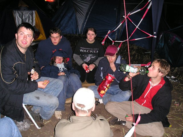 Wir setzten uns an den Hang. Naja, was die Jungs auf der Bühne von sich gaben klang so auf CD bessa. Also ich kenn nur 2 Songs. Danach lief ich mit den anderen wieder hoch zu den Zelten. Dort gabs noch Bier. So nun ging ich noch mit Kumpels über den Platz, bis wir dann in ein Zelt einkehrten, wo 6 Mädels ein Saufspielchen spielten. ...und wir waren schon so dicht. *rolleyes* Naja keiner von uns kapierte es und es wurd trotzdem mitgemacht. Zu trinken gabs dann nur Wodka. Sehr merkwürdig die Runde. ...joah und dann sind wir auch irgendwann wieder -also meine Kumpels und ich- zurück zu den Zelten. ;)